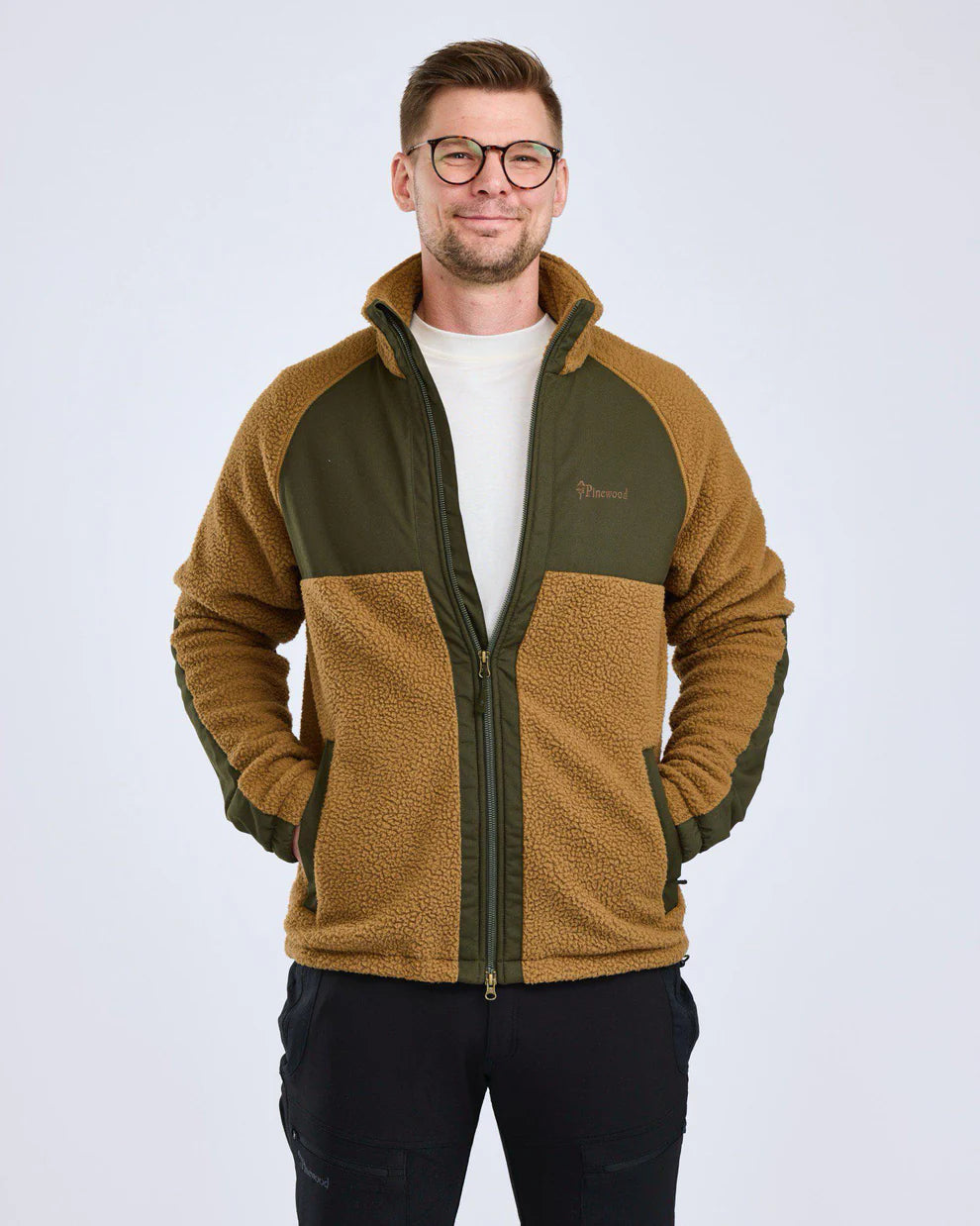 Flot herre fleecejakke fra Pinewood, er lavet i et luftigt materiale der efterligner fåreuld. Det bløde stof er lydløst og isolerende, hvilket gør den kan bruges både som mellemlag og jakke. Der er snører nede i taljen, så den kan strammes ind. Den har 2-vejs lynlås. Den er forstærket med slidstærkt TC-Lite stof ved brystet og ærmerne. Der er to lommer med lynlås.