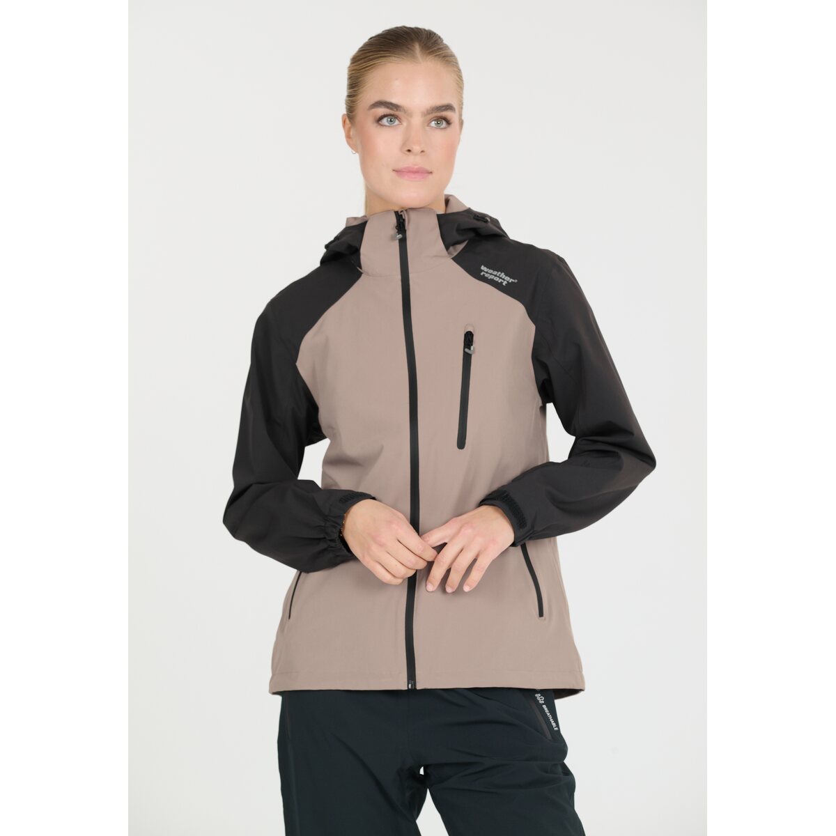 En flot regnjakke til damer i høj strækbar kvalitet, der sagtens kan anvendes som praktisk outdoor/fritidsjakke hele året. Det strækbare stof giver rig mulighed for bevægelse og aktivitet. Jakken har et vandsøjletryk på op til 15.000 mm, og kan derfor sagtens holde vandet ude i vedholdent regnvejr. Jakken er åndbar, og er derfor ideel til en rask vandretur.